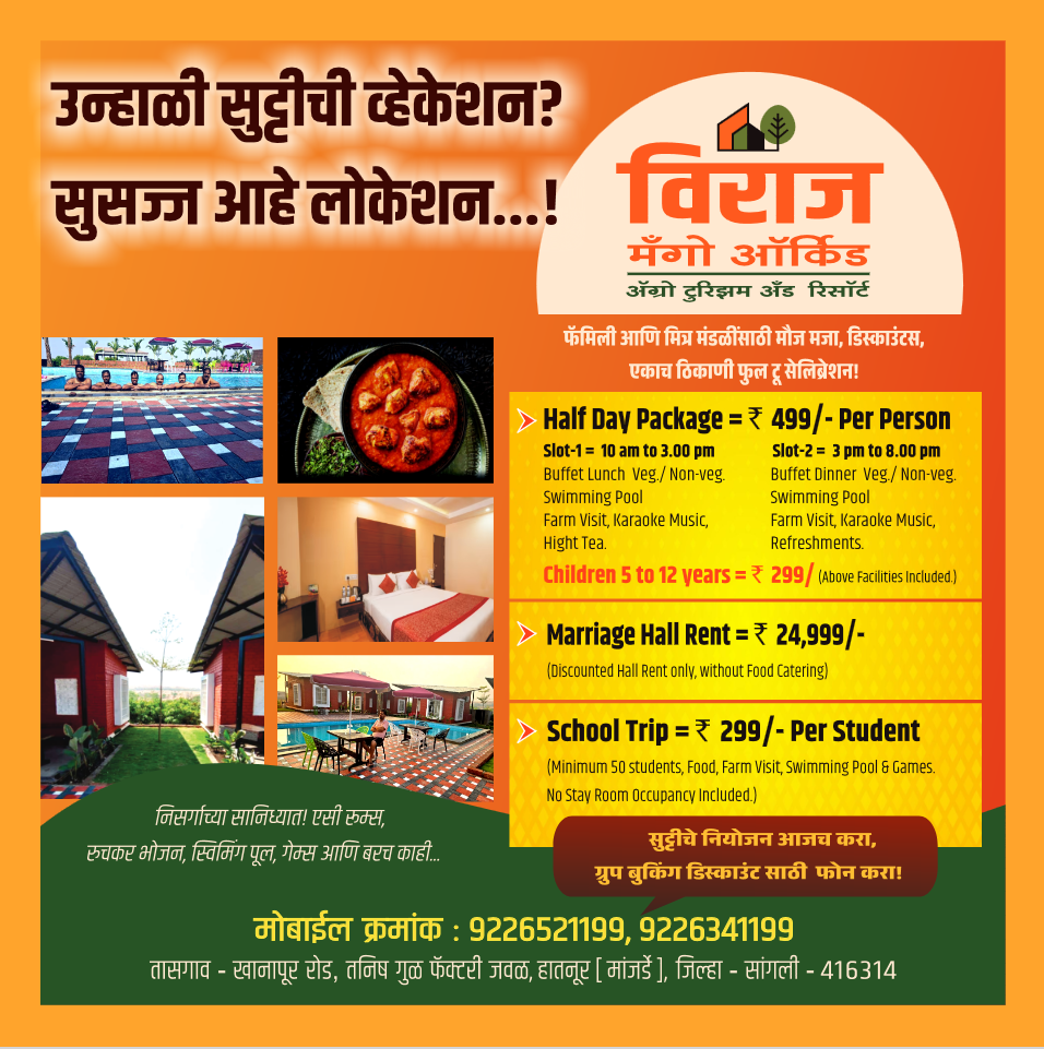 Viraj Mango Orchid Agritourism and Resort is a luxury getaway that seamlessly blends natural beauty with modern amenities. The resort features elegantly designed rooms and suites, a multipurpose hall, and a range of adventure activities. Guests can unwind by the swimming pool, take a leisurely stroll through the orchards, or indulge in delicious multicuisine.